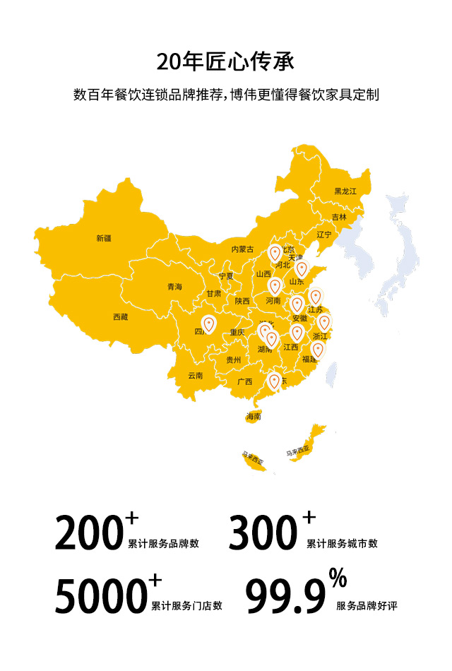 博偉餐飲家具專業服務餐飲家具20余年,先后服務1000+連鎖餐飲,業務覆蓋10多個省份300+城市,用好原料做好桌椅,全國質保,注重品質服務。